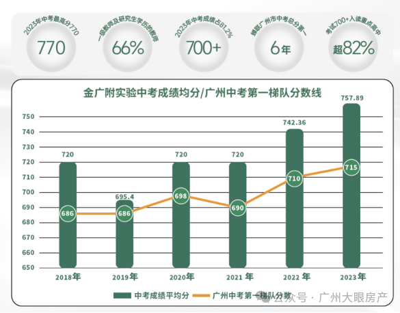 白云广附云湖学校师资亦是势力雄厚,近年来,白云广附中考成绩一直名列广州前茅,以白云广附核心学校金广附为例——继广州中考成绩五连冠后,2023年又拿下了广州中考最高分770的好成绩。