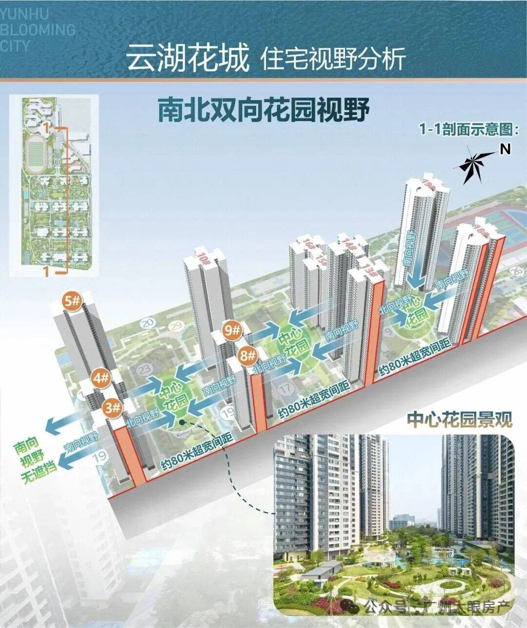 项目整体抬高了16米,有效阻断噪音,楼栋为排列式布局,82米超宽楼间距。
